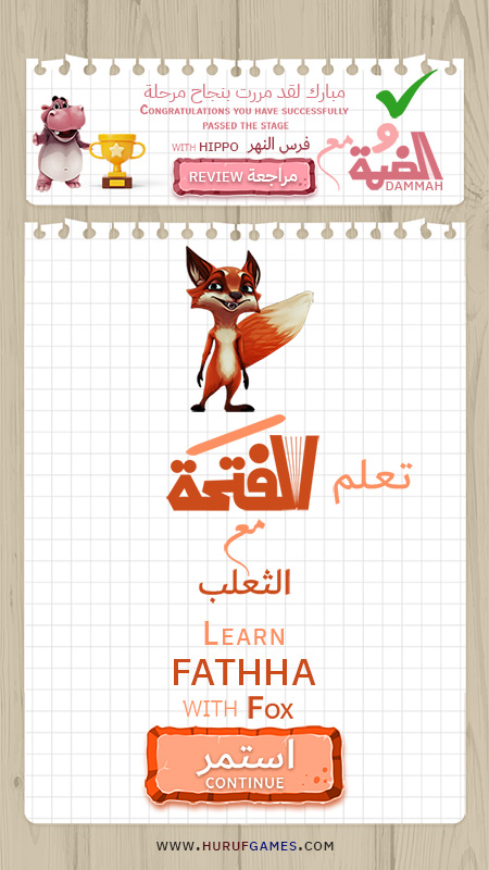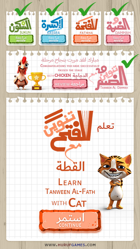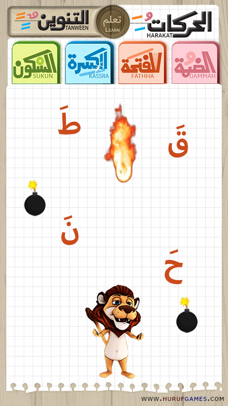 اللعبة عبارة عن سبع مراحل ولكل مرحلة حركة وسيعرف كامل الحركات الضمة – الفتحة – الكسرة – السكون ثم تنوين الضم و الفتح و الكسر ولكل مرحلة حيوان.